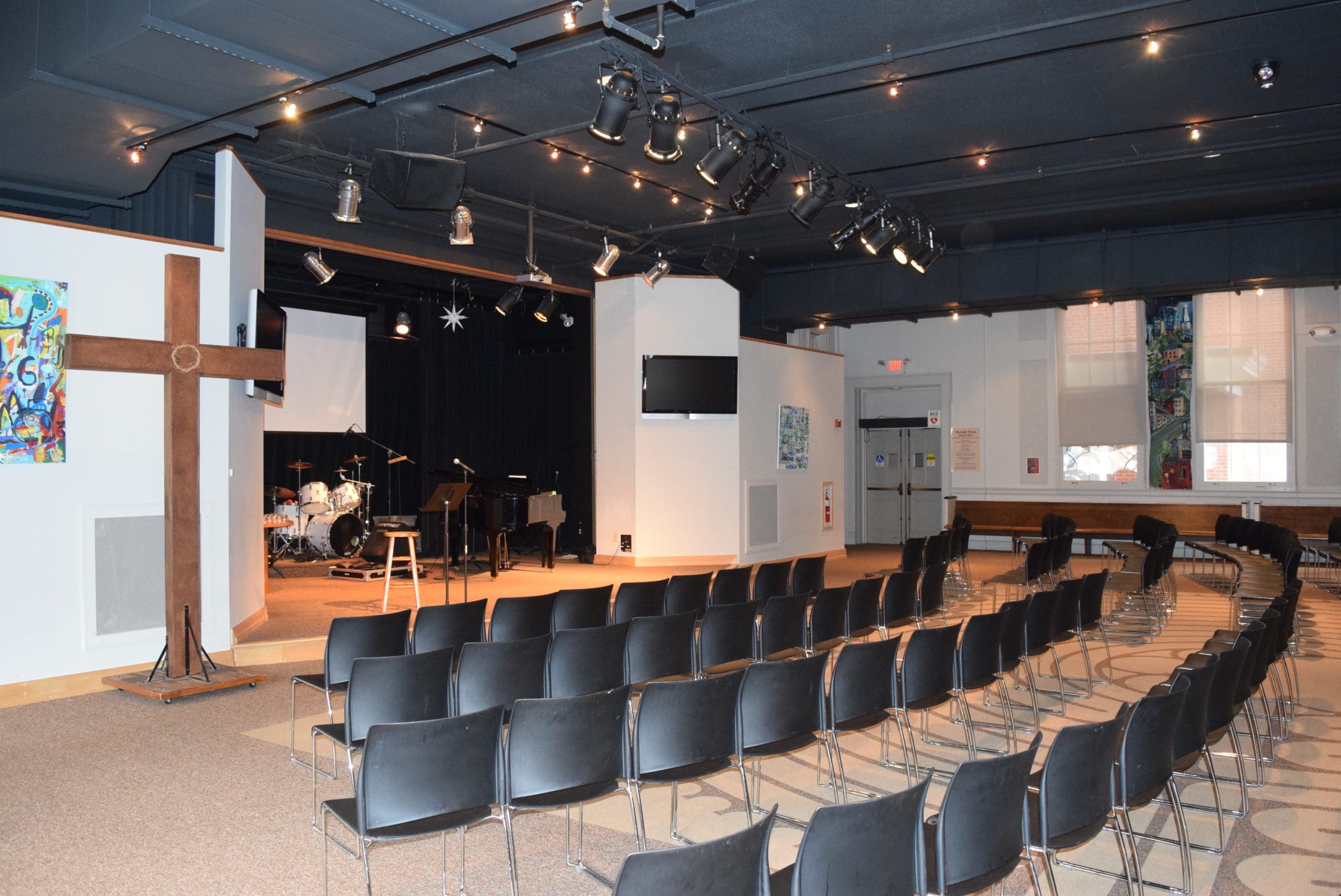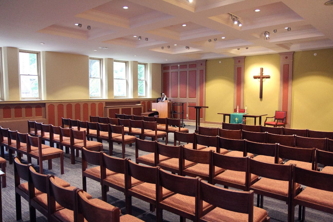 Renovations to the existing chapel were intended to transform a rigid layout into a flexible, multi-use space. Fixed elements including pews, a raised platform, and other large immobile equipment were replaced with chairs and other light-weight movable furnishings.