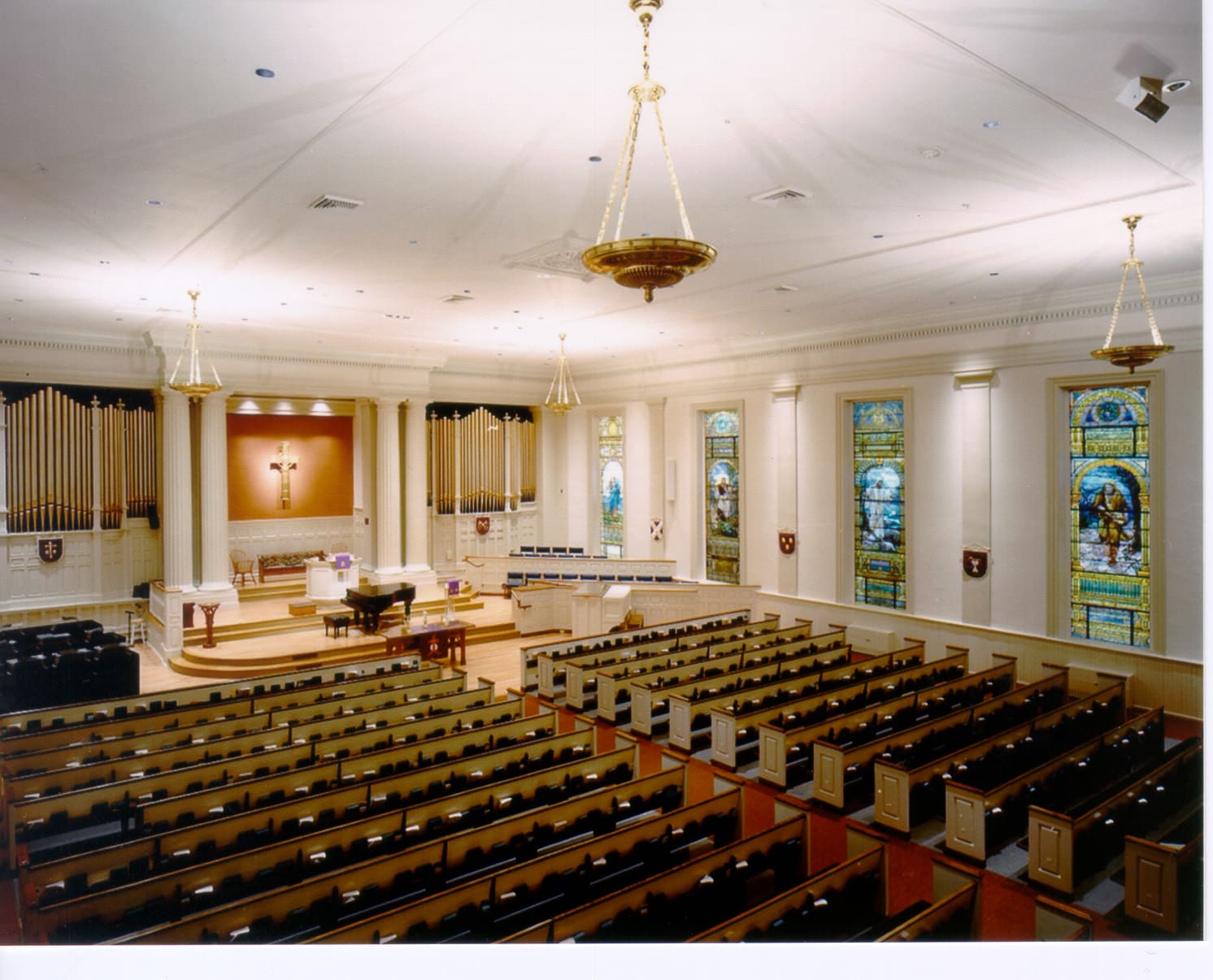 The Sanctuary renovation of the National Register Greek Revival church was completed in 2003. Extensive documentation was done before demolition to preserve historic points of reference and complete the project in just ten weeks. Renovations included stained glass restoration, lighting improvements, new color scheme and repainting, new flooring, custom fabricated communion table and baptismal font designed by Hammel Associates. A new design for the Chancel and Choir Area includes a ramp to provide full accessibility for music and other program